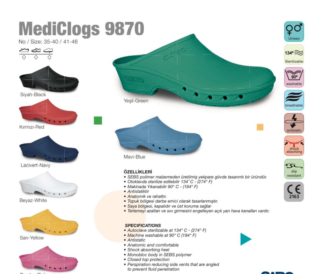 The MediClogs 9870 are high-quality medical clogs made from SEBS polymer material, designed for comfort and durability. They are available in various colors such as black, green, red, navy, blue, white, and yellow, and come in sizes ranging from 35-40 (small) to 41-46 (large). These clogs are autoclave sterilizable at 134°C (274°F) and machine washable at 90°C (194°F). They feature anatomic design, shock-absorbing heels, and anti-slip soles, ensuring comfort and safety for healthcare professionals. The closed-top design offers full protection, while angled vents reduce perspiration and help maintain a comfortable environment for your feet during long hours.
